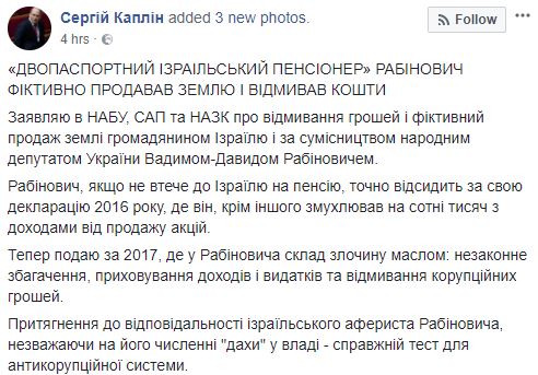 "Двухпаспортный израильский пенсионер" Рабинович фиктивно продавал землю и отмывал средства. Заявляю в НАБУ (Национальное антикоррупционное бюро Украины), САП (Специализированную антикоррупционную прокуратуру) и НАПК (Национальное агентство по предотвращению коррупции) об отмывании денег и фиктивной продаже земли гражданином Израиля и по совместительству народным депутатом Украины Вадимом-Давидом Рабиновичем", - пишет нардеп.