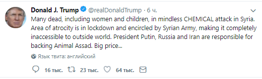 "Президент Владимир Путин, Россия и Иран ответственны за поддержку животного Башара Асада. Придется заплатить большую цену", - написал американский президент.