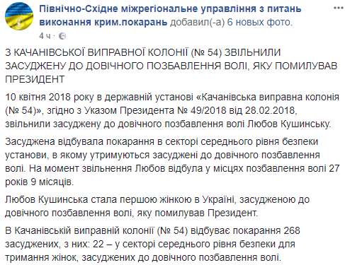 "Осужденная отбывала наказание в секторе среднего уровня безопасности учреждения, в котором содержатся осужденные к пожизненному лишению свободы. Любовь Кушинськая стала первой женщиной в Украине, осужденной к пожизненному лишению свободы, которую помиловал президент»,- говорится в сообщении.