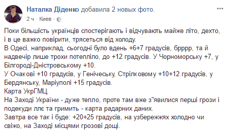 "В Одессе, например, сегодня было днем ​​+6 +7 градусов, и вечером только немного потеплело, до +12 градусов. В Черноморске +7, в Белгороде-Днестровском - +10. В Очакове - +10 градусов, в Геническе, Стрелковом +10 +12 градусов, в Бердянске, Мариуполе +15 градусов. На Западе Украины - очень тепло, но там уже появились первые грозы и местами льет и гремит - карта радарных данных. Завтра все так и будет: +20 +25 градусов, на побережье холодно или свежо, на Западе местами грозовые дожди", - говорится в сообщении.
