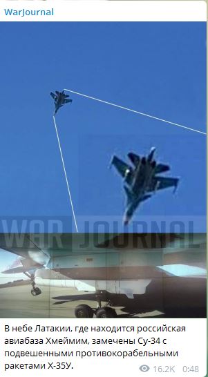 "В небе Латакии, где расположена российская авиабаза Хмеймим, замечены Су-34 с подвешенными противокорабельными ракетами Х-35У", - говорится в сообщении.