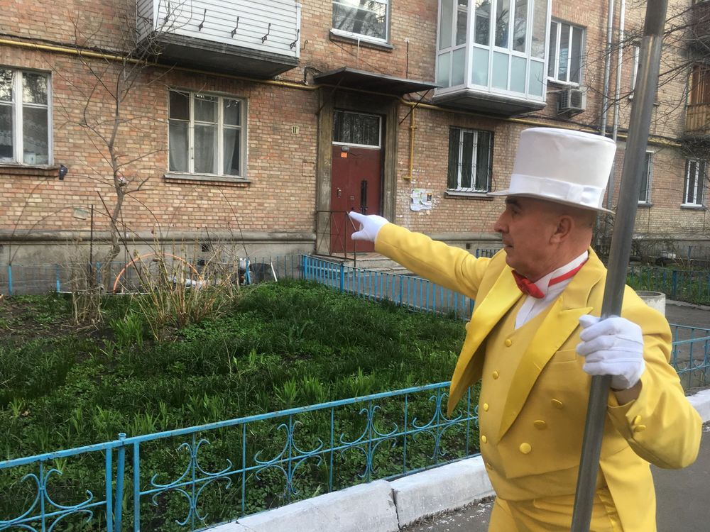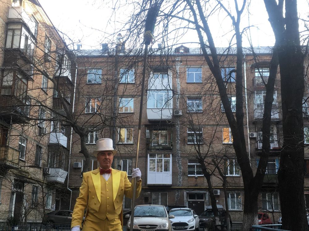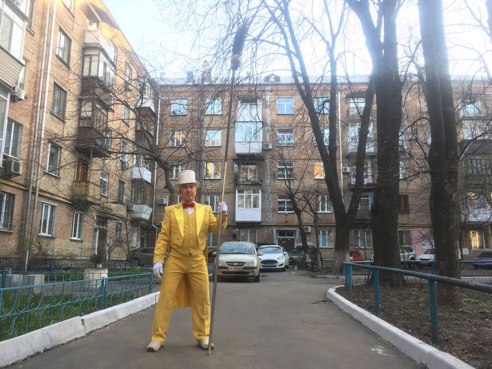 Популярный киевский дворник Александр Остапенко, который подметает столичные улицы во фраке, обзавелся желтым смокингом.