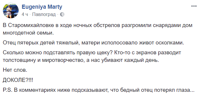 Отец пятерых детей тяжелый, матери исполосовало живот осколками", - пишет в Facebook дончанка Евгения Мартынова.