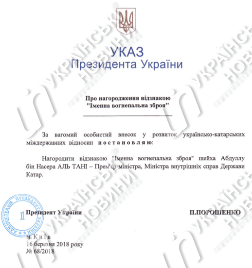 Президент Петр Порошенко наградил премьер-министра Кувейта и премьер-министра Катара именным огнестрельным оружием.