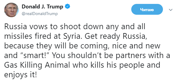 "Приготовься, Россия, потому что они придут, славные и новые, и "умные!" (ракеты). Вы не должны быть партнерами с животными, убивающими газом, убивающими своих людей и наслаждающимися этим!" - написал Трамп в Twitter.