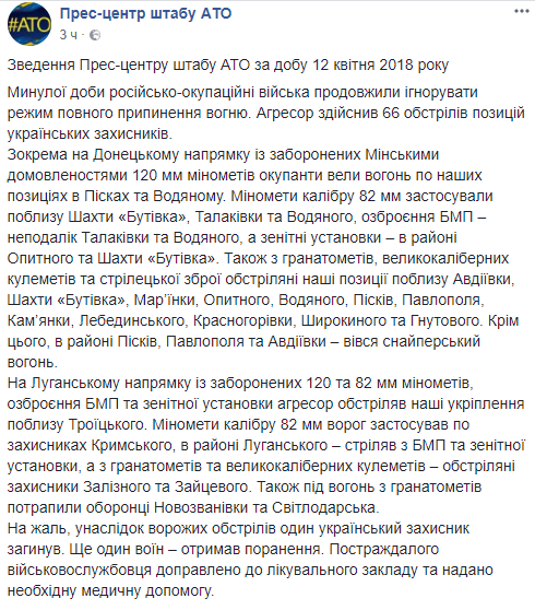 За минувшие сутки противник 66 раз открывали огонь по позициям сил АТО. Вследствие вражеских обстрелов один украинский военный погиб, еще один получил ранения. Об этом сообщает пресс-центр штаба АТО.