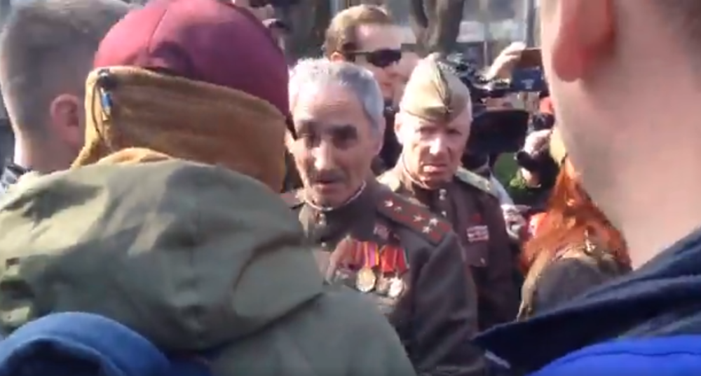 Позже на митинг пришли ветераны. "Эй, пилотка, ты какого года рождения? Тебе не стыдно за покупные медали, ветеран?" – закричали им радикалы.