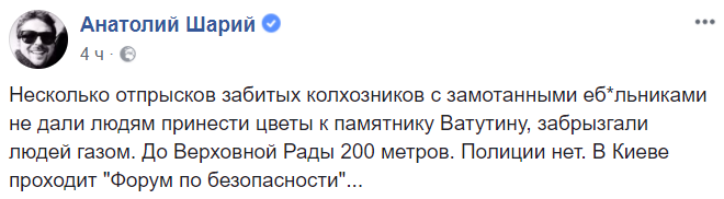 "Несколько отпрысков забитых колхозников с замотанными еб*льниками не дали людям принести цветы к памятнику Ватутину, забрызгали людей газом. До Верховной Рады 200 метров. Полиции нет. В Киеве проходит "Форум по безопасности"... " – пишет журналист Анатолий Шарий в Facebook.