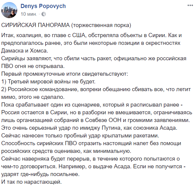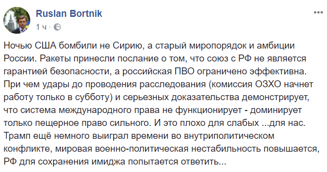 "Ночью США бомбили не Сирию, а старый миропорядок и амбиции России. Ракеты принесли послание о том, что союз с РФ не является гарантией безопасности, а российская ПВО ограничено эффективна. При чем удары до проводения расследования (комиссия ОЗХО начнет работу только в субботу) и серьезных доказательства демонстрирует, что система международного права не функционирует - доминирует только пещерное право сильного.