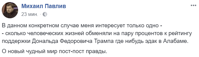 "В данном конкретном случае меня интересует только одно - сколько человеческих жизней обменяли на пару процентов к рейтингу поддержки Дональда Федоровича Трампа где нибудь эдак в Алабаме.