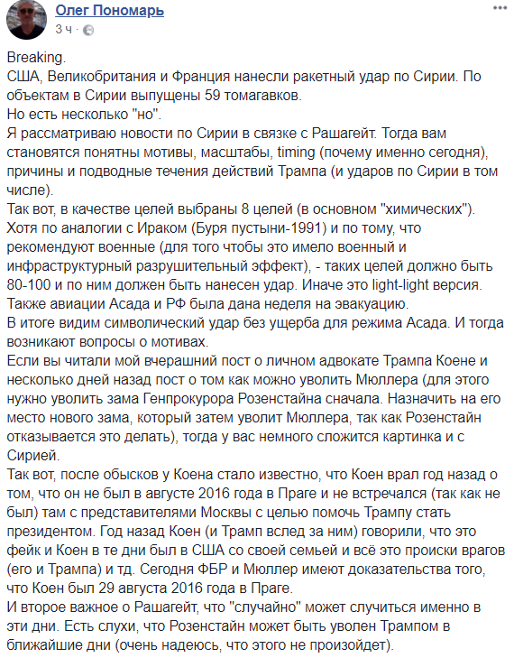 А вот пропрезидентский блогер Олег Пономарь назвал удар символическим и без ущерба для Дамаска. По его мнению, Трамп преследует цель решить с помощью этого обстрела внутренние проблемы, связанные с активизацией "кремлингейта".