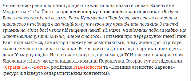 Сюжет телеканала "1+1" про украинскую пенсионерку из агитационного ролика Петра Порошенко назван "Самой яркой манипуляцией недели" согласно еженедельного обзора сайта "Детектор медиа"