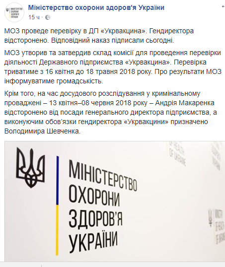 "Минздрав образовал и утвердил состав комиссии для проведения проверки деятельности Государственного предприятия "Укрвакцина". Проверка продлится с 16 апреля до 18 мая 2018 года", - говорится в сообщении.