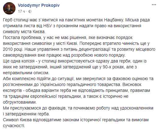 "Герб столицы должен появиться на памятных монетах Нацбанка. Городской совет получил письмо от НБУ с просьбой предоставить право на использование символа города Киева. Возникла проблема, у нас нет решения, которое определяет порядок использования символики в городе Киеве. Предварительное утратило силу еще в 2010 году. Наше управление по вопросам децентрализации и развития местного самоуправления уже работает над разработкой нового порядка", - написал он.