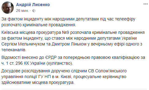 "Киевская местная прокуратура №9 начала уголовное производство по факту инцидента, произошедшего между народными депутатами Украины Сергеем Мельничуком и Дмитрием Линько в вечернем эфире одного из телеканалов.
