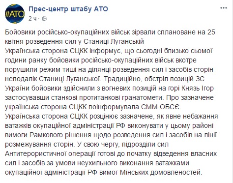 Боевики сорвали запланированное на 25 апреля разведение сил и средств в поселке Станица Луганская. Как сообщает пресс-центр штаба АТО на своей странице в Facebook, в четверг, 19 апреля, сепаратисты вновь нарушили режим тишины.