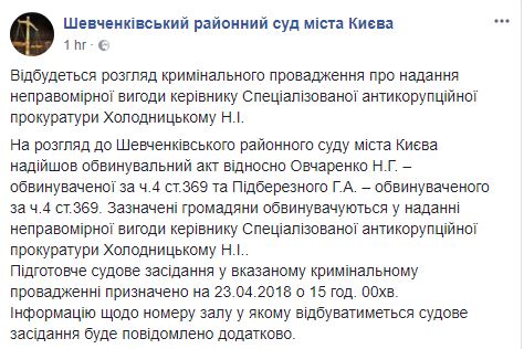 "На рассмотрение в Шевченковский районный суд Киева поступил обвинительный акт в отношении Овчаренко Н. – обвиняемой по ч.4 ст.369 и Подберезного Г. - обвиняемого по ч.4 ст.369. Указанные граждане обвиняются в предоставлении неправомерной выгоды руководителю Специализированной антикоррупционной прокуратуры Холодницкому", - сказано в сообщении суда на странице в социальной сети Facebook в четверг.
