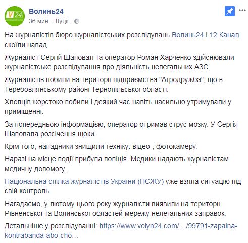 "Журналист Сергей Шаповал и оператор Роман Харченко осуществляли журналистское расследование о деятельности нелегальных АЗС", - отмечается в сообщении.