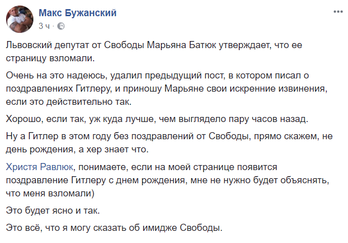 Сама Марьяна Батюк позже открестилась от поста на Facebook.