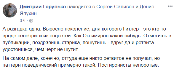 "А разгадка одна. Выросло поколение, для которого Гитлер - это кто-то вроде селебрити из соцсетей. Как Оксимирон какой-нибудь. Отметишь в публикации, поздравишь старика, пошутишь - вдруг да и ретвита удостоишься, чем черт не шутит.