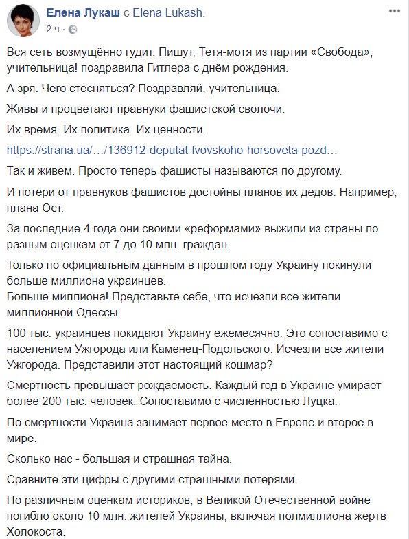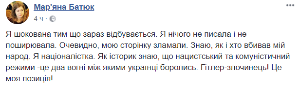 "Я шокирована тем, что сейчас происходит. Я ничего не писала и не распространяла. Очевидно, мою страницу взломали. Знаю, как и кто убивал мой народ. Я националистка. Как историк знаю, что нацистский и коммунистический режимы -это два огня между которыми украинцы боролись. Гитлер-преступник! Это моя позиция!"