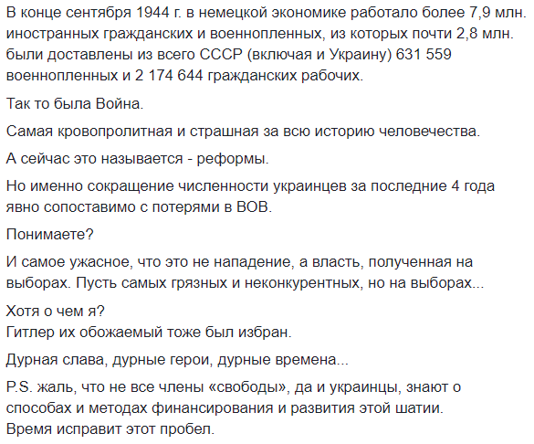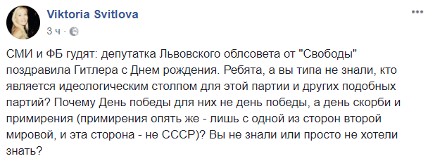 "Ребята, а вы типа не знали, кто является идеологическим столпом для этой партии (ВО Свобода - ред.) и других подобных партий? Почему День победы для них не день победы, а день скорби и примирения (примирения опять же - лишь с одной из сторон второй мировой, и эта сторона - не СССР)? Вы не знали или просто не хотели знать?"