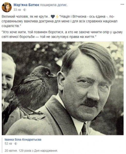 Представитель ВО Свобода Марьяна Батюк опубликовала у себя в Facebook "няшную" фотографию фюрера, назвала его "большим человеком" и привела две цитаты из "нацистской библии" Mein Kampf ("Моя борьба").