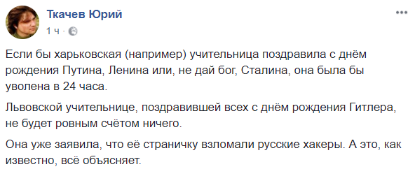 "Если бы харьковская (например) учительница поздравила с днём рождения Путина, Ленина или, не дай бог, Сталина, она была бы уволена в 24 часа.