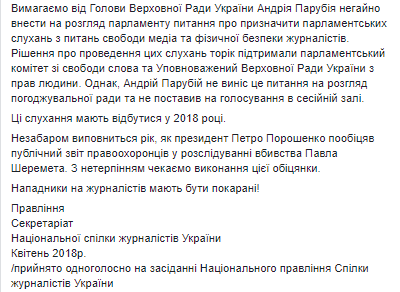 "Требуем от председателя Верховной Рады Украины Андрей Парубий немедленно внести на рассмотрение парламента вопрос о назначить парламентских слушаний по вопросам свободы СМИ и физической безопасности журналистов", - написал глава НСЖУ.