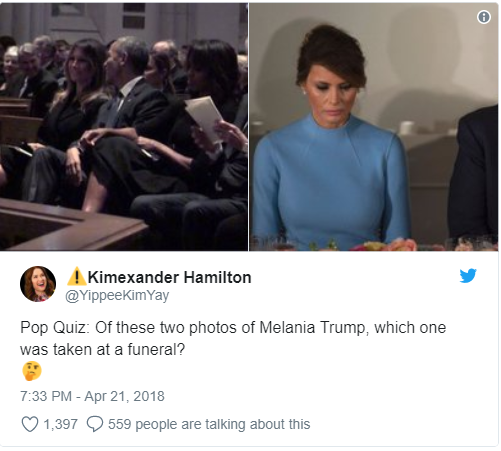 "Догадайтесь, какое из этих снимков Мелании Трамп было сделано на церемонии похорон?", - не успокаиваются пользователи.