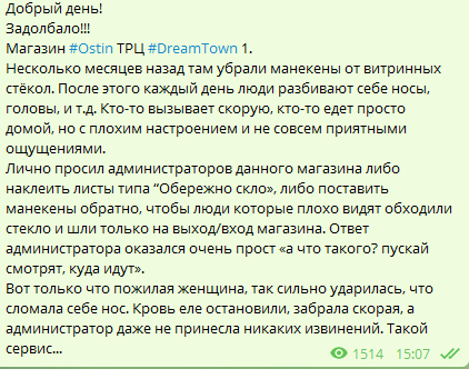 "После этого каждый день люди разбивают себе носы и головы. Кто-то вызывает скорую, кто-то едет просто домой, но с плохим настроением и не совсем приятными ощущениями. Лично просил администраторов данного магазина либо наклеить листы типа "Обережно скло", либо поставить манекены обратно, чтобы люди которые плохо видят, обходили стекло и шли только на выход/вход магазина. Ответ администратора оказался очень прост "а что такого? пускай смотрят, куда идут", - говорится в сообщении.