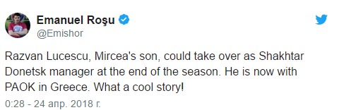 Сын бывшего наставника "Шахтера" Мирчи Луческу Разван Луческу может стать новым главным тренером донецкого клуба. Об этом сообщает в своем Twitter румынский журналист Эммануэль Розу.