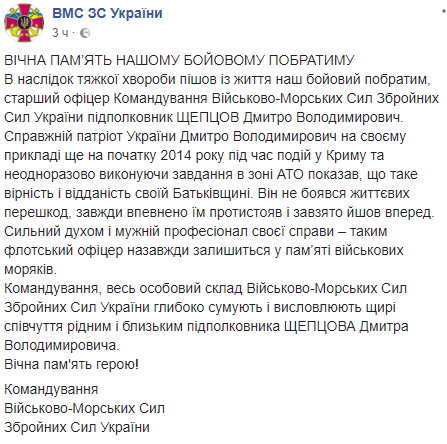 "Настоящий патриот Украины Дмитрий Владимирович на своем примере еще в начале 2014 года во время событий в Крыму показал, что такое верность и преданность своей Батькивщине… Сильный духом и мужественный профессионал своего дела - таким флотский офицер навсегда останется в памяти военного моряка", - говорится в сообщении.
