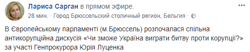 Во время дискуссии выступал генпрокурор Юрий Луценко, сообщает его пресс-секретарь Лариса Сарган, которая обнародовала прямую трансляцию в Facebook
