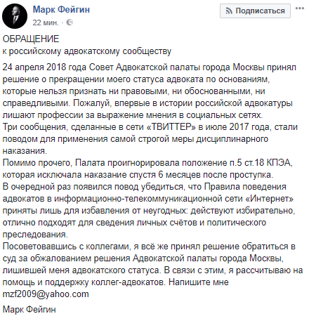 "Пожалуй, впервые в истории российской адвокатуры лишают профессии за выражение мнения в социальных сетях. Три сообщения, сделанные в сети Twitter в июле 2017 года, стали поводом для применения самой строгой меры дисциплинарного наказания", - напомнил Фейгин о причинах решения Совета адвокатской палаты Москвы от 24 апреля.