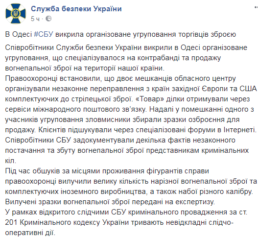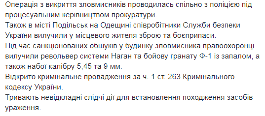 Изъятые образцы огнестрельного оружия переданы на экспертизу. Открыто уголовное производство по ст. 201 Уголовного кодекса (контрабанда).