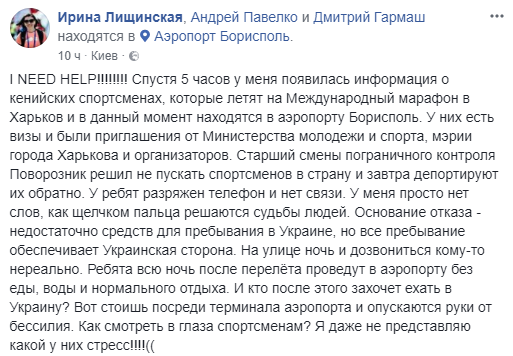 "У ребят разряжен телефон и нет связи. У меня просто нет слов, как щелчком пальца решаются судьбы людей. Основание отказа - недостаточно средств для пребывания в Украине, но все пребывание обеспечивает Украинская сторона. На улице ночь и дозвониться кому-то нереально. Ребята всю ночь после перелёта проведут в аэропорту без еды, воды и нормального отдыха. И кто после этого захочет ехать в Украину?" - написала она.