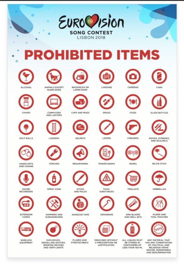 Организаторы песенного конкурса Евровидение-2018, который 8 мая начнется в Португалии, обнародовали список предметов, запрещенных на территории проведения шоу. Перечень запрещенных предметов опубликовали в Twitter мероприятия.
