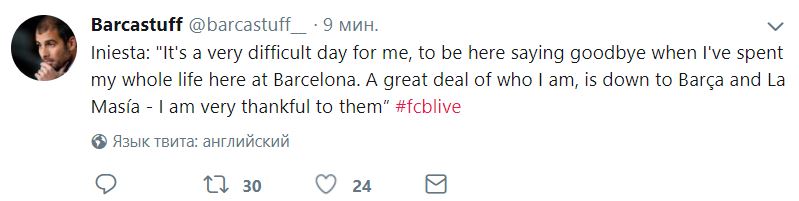 Полузащитник "Барселоны" Андрес Иньеста официально объявил, что уходит из команды по окончании сезона. Об этом сообщает издание Barca Stuff в Twitter.