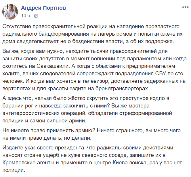 "Отсутствие правоохранительной реакции на нападение провластного радикального бандформирования на лагерь ромов и попытки сжечь их дома свидетельствует не о бездействии власти, а об их поддержке.