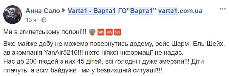 "Уже почти сутки не можем вернуться домой, рейс Шарм-эль-Шейх, авиакомпания YanAir 5216. Никто никакой информации не предоставляет. Нас 200 человек, из них 45 детей, все голодные и сильно замерзли. Дети плачут, а всем безразлично и мы в безвыходной ситуации. Представители (туроператора) JoinUp "забили" на всех. Сейчас ситуация очень напряженная, у людей уже сдают нервы. Сейчас нам предлагают аннулировать старые билеты и поселить в отель. Но обратного билета у нас нет. Придется покупать билеты самостоятельно?! А самое смешное то, что самолеты этой фирмы на Киев вылетают спокойно, а во Львов все отменены", - сообщила Анна Сало.