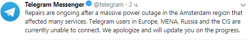 Сбой в работе мессенджера Telegram, который наблюдается 29 апреля, произошел из-за отключения электричества в окрестностях Амстердама.