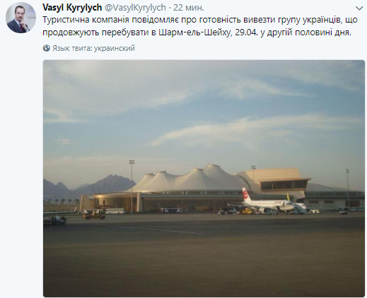 "Туристическая компания сообщает о готовности вывезти группу украинцев, которые продолжают находиться в Шарм-эль-Шейхе, 29.04. во второй половине дня", - написал он.
