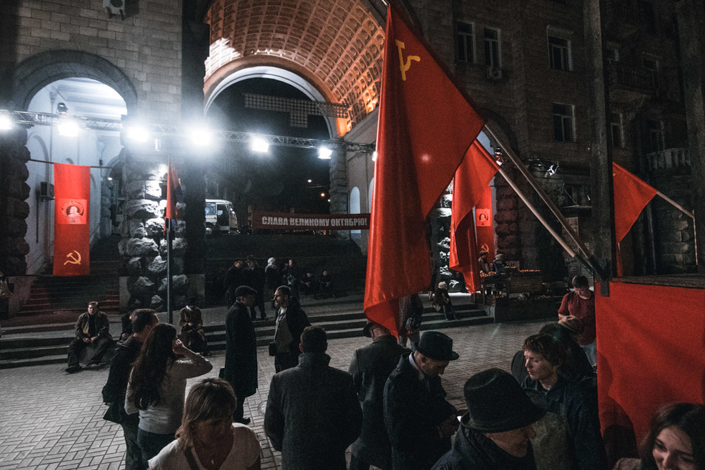 В Киеве в ночь на 30 апреля на Крещатик вернули обстановку 1960-х годов - развернули красные флаги и развесили транспаранты "Слава Великому Октябрю". Любопытно, что некоторые, ставшие очевидцами такого возврата к прошлому были, мягко говоря, удивлены. Впечатлениями от увиденного люди делились в соцсетях.