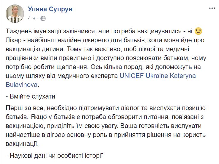 И.о министра здравоохранения Ульяна Супрун поделилась на своей странице в Facebook cоветами по поводу иммунизации. Она, в частности, процитировала эксперта по иммунизации ЮНИСЕФ Екатерину Булавинову.