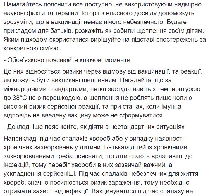 К ним относятся риски из-за отказа от вакцинации, и реакции, которые могут быть вызваны прививкой. Напомните, что по международным стандартам, легкая простуда даже с температурой до 38 ° С не является препятствием, а прививки не делают только когда есть высокий риск серьезной реакции, и при состояниях, когда иммунный ответ на введенную вакцину может не сформироваться.