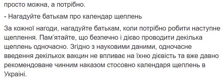 При каждом удобном случае, напоминайте родителям, когда нужно делать следующее прививки. Помните, что безопасно и действенно проводить несколько прививок одновременно. Согласно научным данным, одновременное введение нескольких вакцин не влияет на их действенность и уже давно рекомендовано действующим приказом о календаря прививок в Украины.