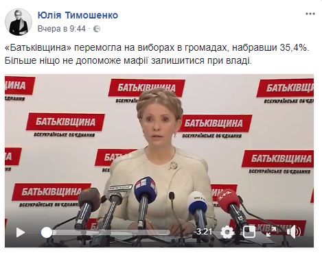 Глава "Батькивщины" Юлия Тимошенко также молчит, а вчера она запостила видео с собой и написала, что партия победила на выборах в громадах, поэтому "больше ничто не поможет мафии остаться при власти".