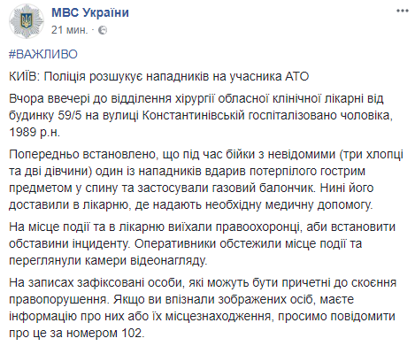 Полиция объявила в розыск напавших на участника АТО в Киеве.