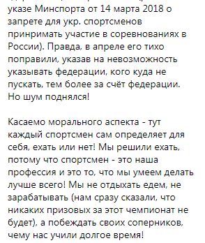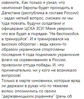 "Меня уверили, что все будет в порядке: "Не беспокойся, а тренируйся". И я тренировался на высоких оборотах – ведь каким-то образом украинские спортсмены последние четыре года поднимали украинские флаги на соревнованиях в России, привозили оттуда победы. И что примечательно, ни у кого не возникало вопросов!" – написал спортсмен.